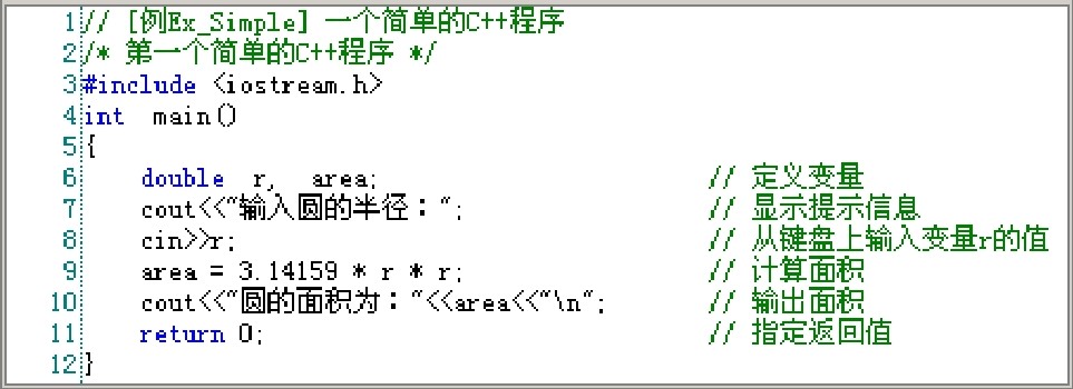 main 函数体的第 1 条(行号为 6)语句是用来定义两个双精度实型(double)变量 r 和area的;第2条(行号为7)语句是一条输出语句,它将双引号中的内容(即字符串)输出到屏幕上,cout 表示标准输出流对象(屏幕),“<<”是插入符,它将后面的内容插入到 cout中,即输出到屏幕上;第 3 条(行号为 8)语句是一条输入语句,cin 表示标准输入流对象(键盘),“>>”是提取符,用来将用户键入的内容保存到后面的变量 r 中;最后一条(行号为10)语句是采用多个“<<”将字符串和变量 area 的内容输出到屏幕中,后面的“\n”是换行符,即在内容输出后回车换行。