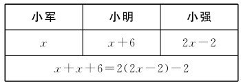 【解析】由“小明给小军3本课外书,则两人购买的课外书一样多”可知,小明比小军多6本,设小军购买的课外书为x本,则小明为x+6本。将三个人购买的课外书列成表格,可以得到: