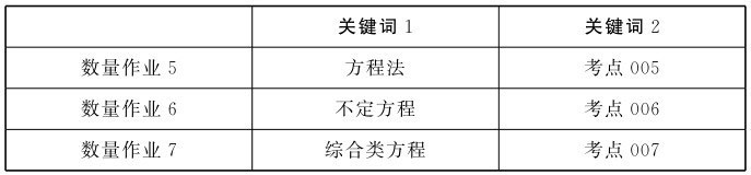 方程法最重要的是找到题干中的等量关系,有些时候等量关系是明显的,如出现了“相等”“相同”“是”等字眼,更多时候等量关系是隐含的,需要考生通过理解题干找到等量关系,而这一点只能通过平时的练习建立起对数学信息的敏感性。